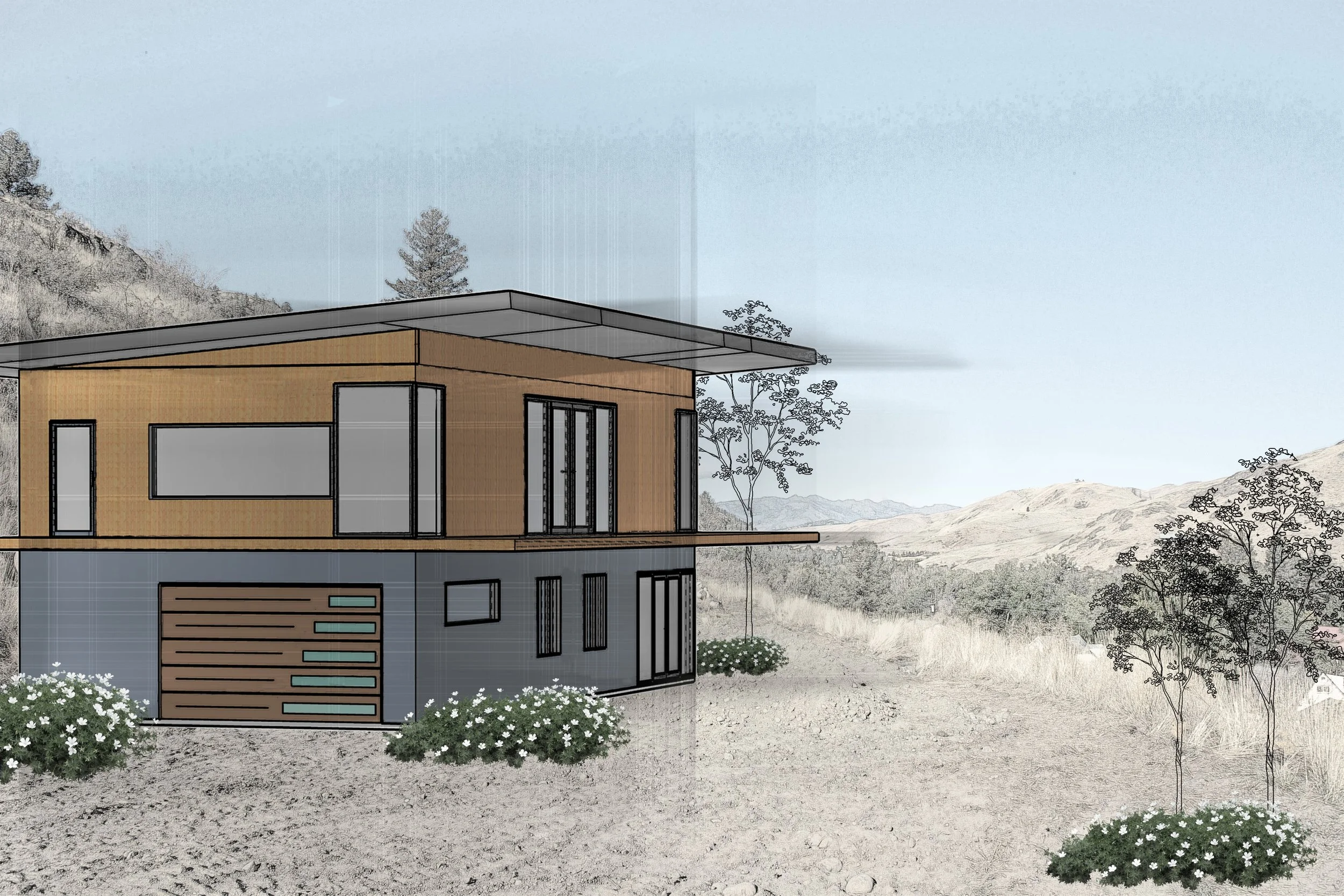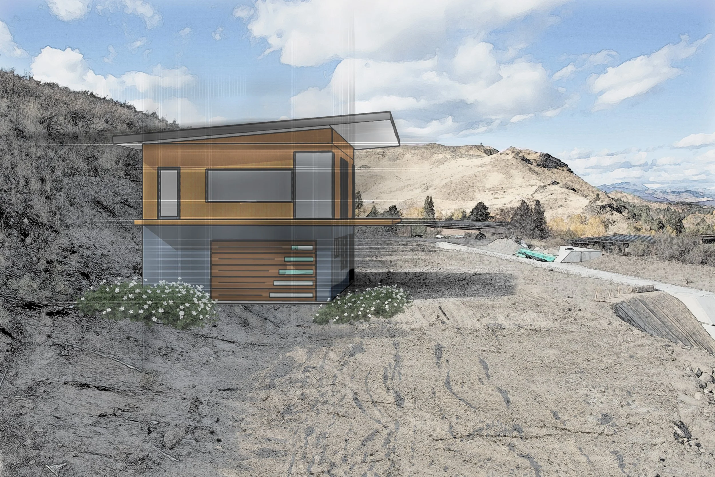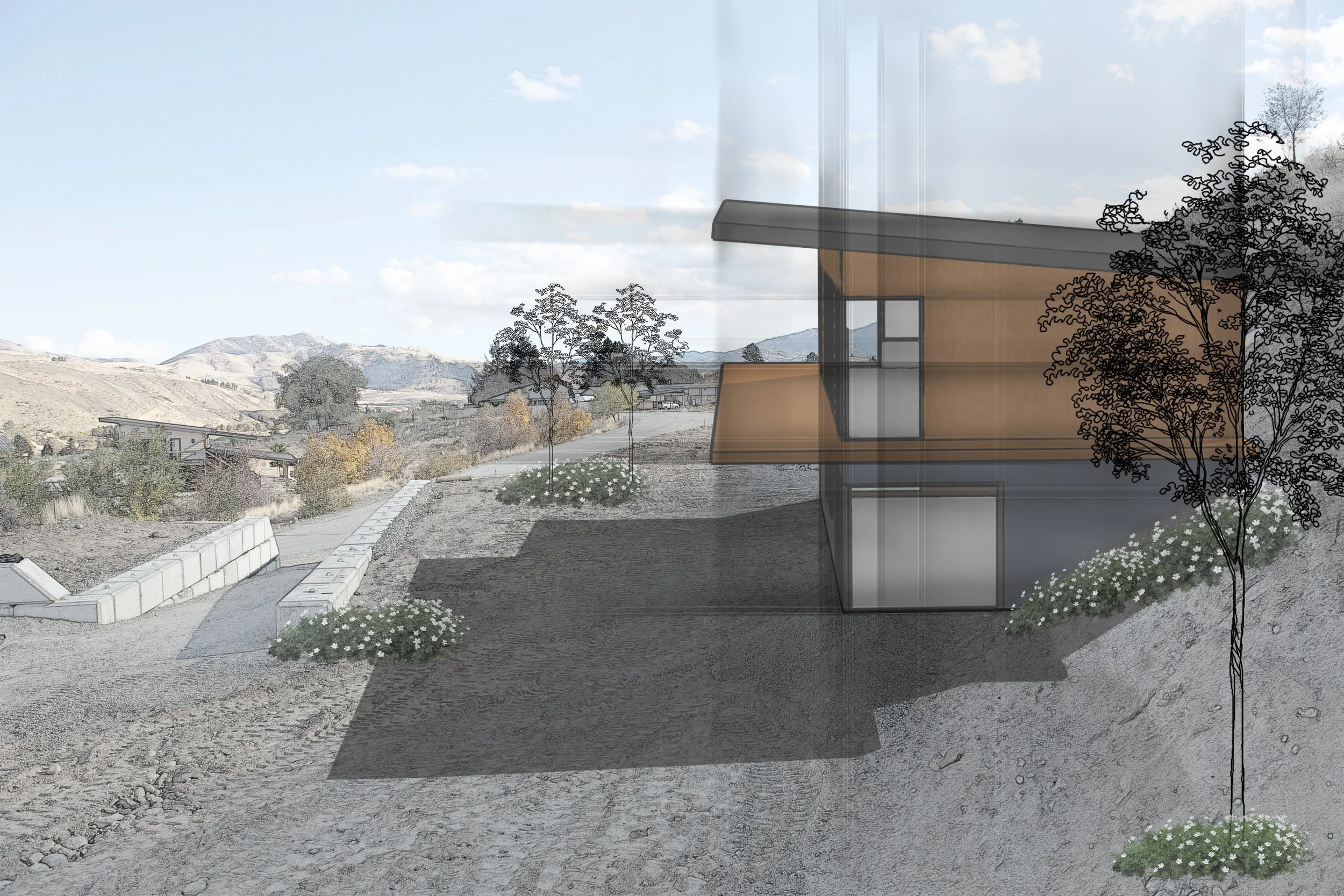 The build site provides for a two-story home partially set into the hillside. Capitalize on the views with bedrooms at ground level and family space above, leveraging floor to ceiling windows for a seamless transition from interior to exterior space. For privacy, add up-down blinds from Harmony House Interiors, who moved from Winthrop for Twisp’s amenities.